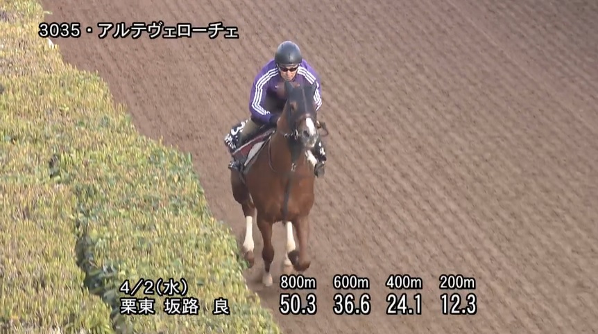 「サラッと。時計的には地味だけど馬なりでラスト1F12秒0だから問題ない。当日のテンションと、阪神は3コーナーで緩むのでペースが鍵になる」