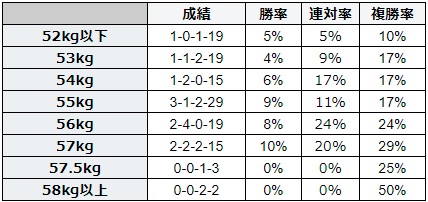 軽量馬は思いのほか好走しておらず、56kg以上の斤量を背負った馬たちが複勝率2割を超えている。