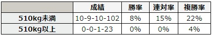 前走の馬体重別でみると510kgを超える大型馬が苦戦傾向にあるようだ。